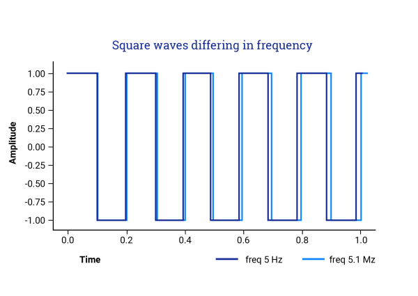 Figure 1: Representation of two square waveforms at different frequencies. It can be seen that the successive slopes slowly move away from each other over time.
