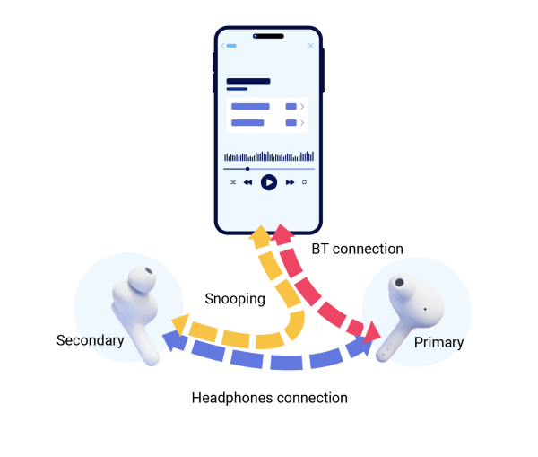 An analogous situation exists with headphones. Both need to monitor the communication because there is no time to transmit the entire audio stream between them. Since it is impossible to connect two headphones to the phone at the same time, the so-called snooping is used. This is a method by which the other headphone, which has all the information about the connection, is able to listen in on the communication and receive the data with audio. The snooping headphone knows when the primary headphone should acknowledge the packet, and if it does not, it can do so on behalf of the primary.